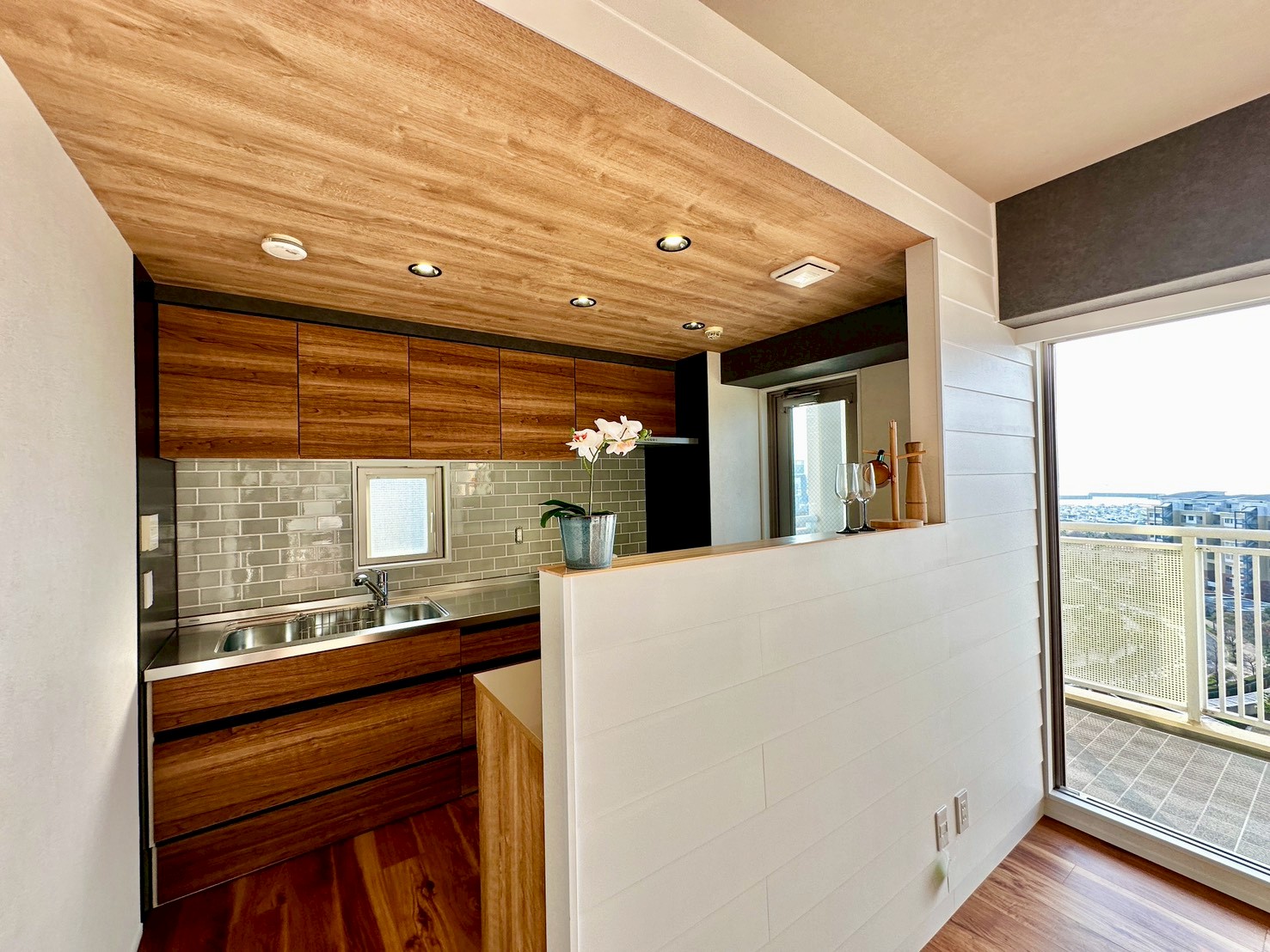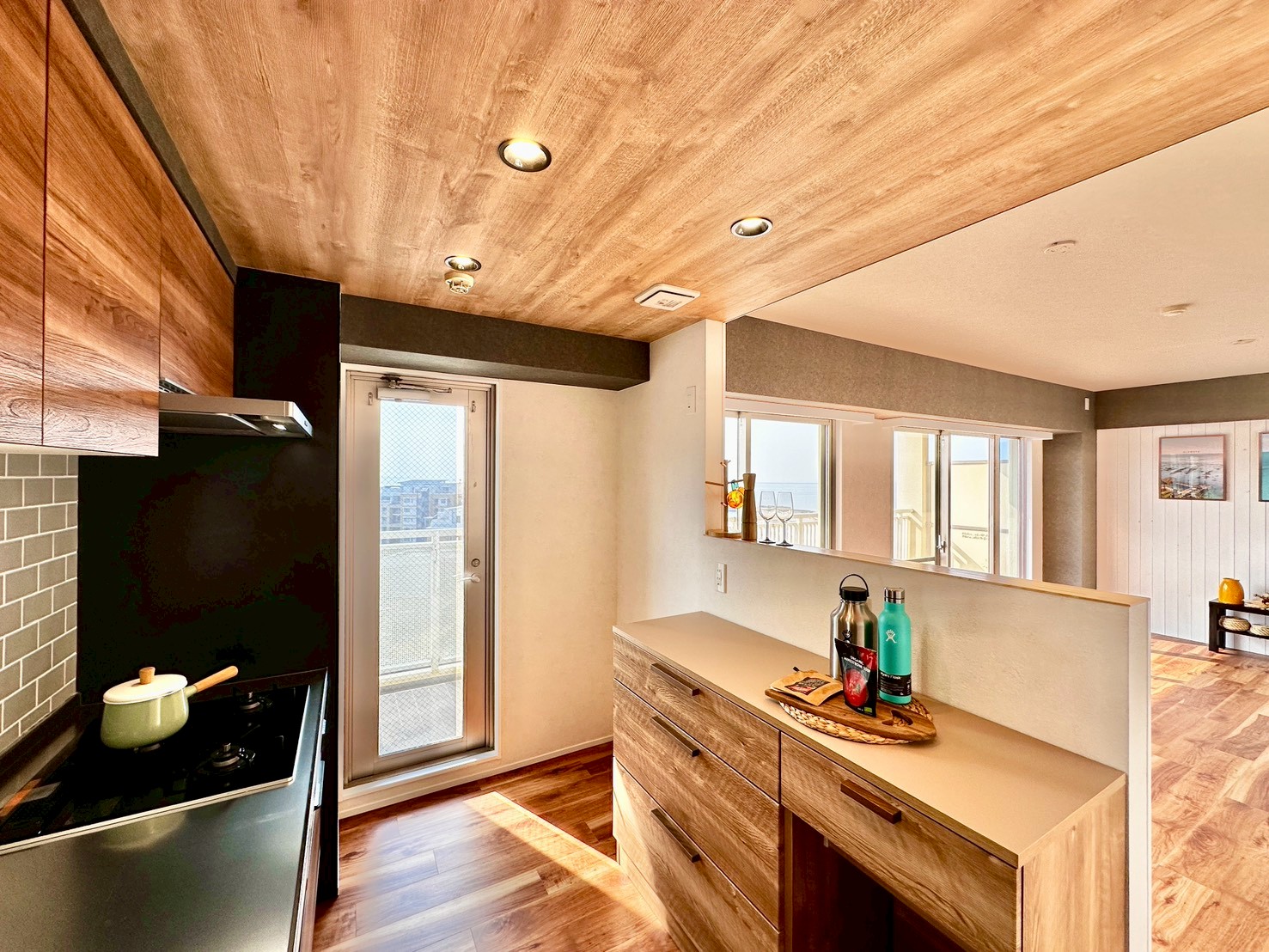 リビングに面する和室を洋室に変更し、キッチンにあった壁を取り払うことで、リビングを見ながらの
